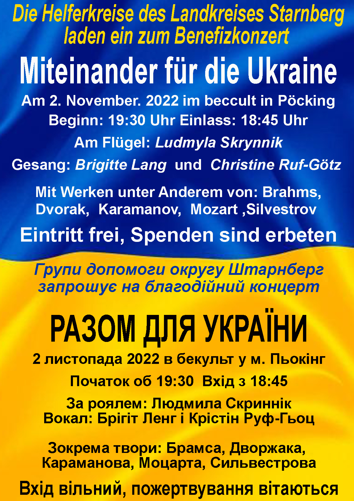 Unter dem Motto “Miteinander für die Ukraine” luden die Helferkreise des Landkreises Starnberg am Mittwochabend zu einem Benefizkonzert für zwei Stiftungen ins beccult, das die Gemeinde Pöcking kostenlos zur Verfügung stellte.