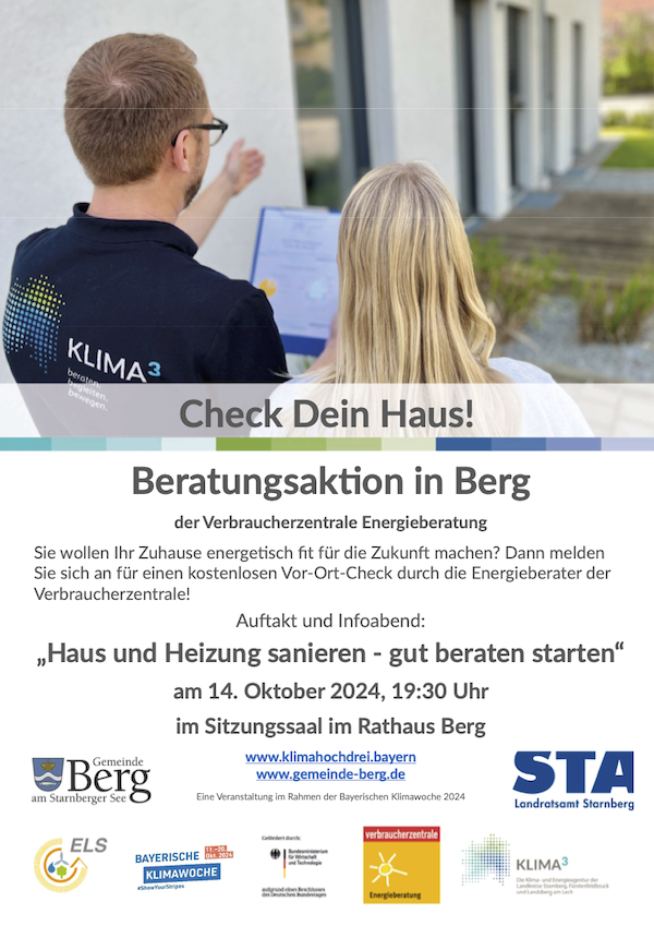 Die Verwaltung der Gemeinde Berg plant in Kooperation mit der Klima hoch drei eine Beratungsaktion der Verbraucherzentrale zum Thema „Haus und Heizung sanieren“. Hierfür übernimmt die Gemeinde mit Unterstützung vom Energiewendeverein Starnberg die Kosten für einen Vor-Ort-Check durch einen Energieberater von der Verbraucherzentrale für 30 Hauseigentümer und -eigentümerinnen in der Gemeinde.